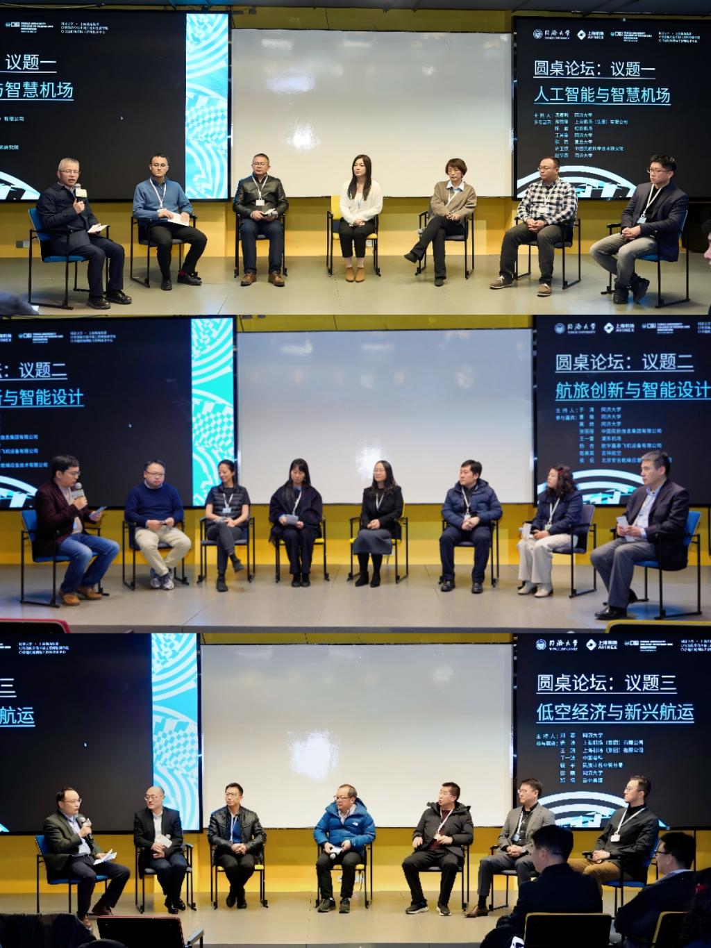 在圆桌论坛环节,3组共22位专家分别围绕“人工智能与智慧机场”“航旅创新与智能设计”“低空经济与新兴航运”等议题展开探讨。