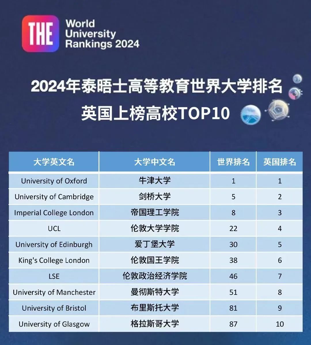 2024泰晤士世界大学排名英国高校排名:英国牛津大学连续8年排在世界第一,剑桥大学排在世界第五,IC排在世界第八。G5院校中的其余两所也排进了世界前50,UCL位列世界第22,LSE位列世界第36。